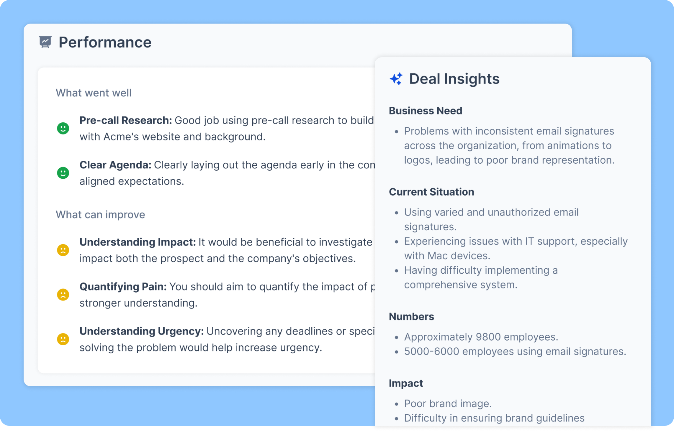 Get aggregated insights across reps and teams. See playbook adherence trends, track who’s improving, and focus coaching on what really impacts deals.