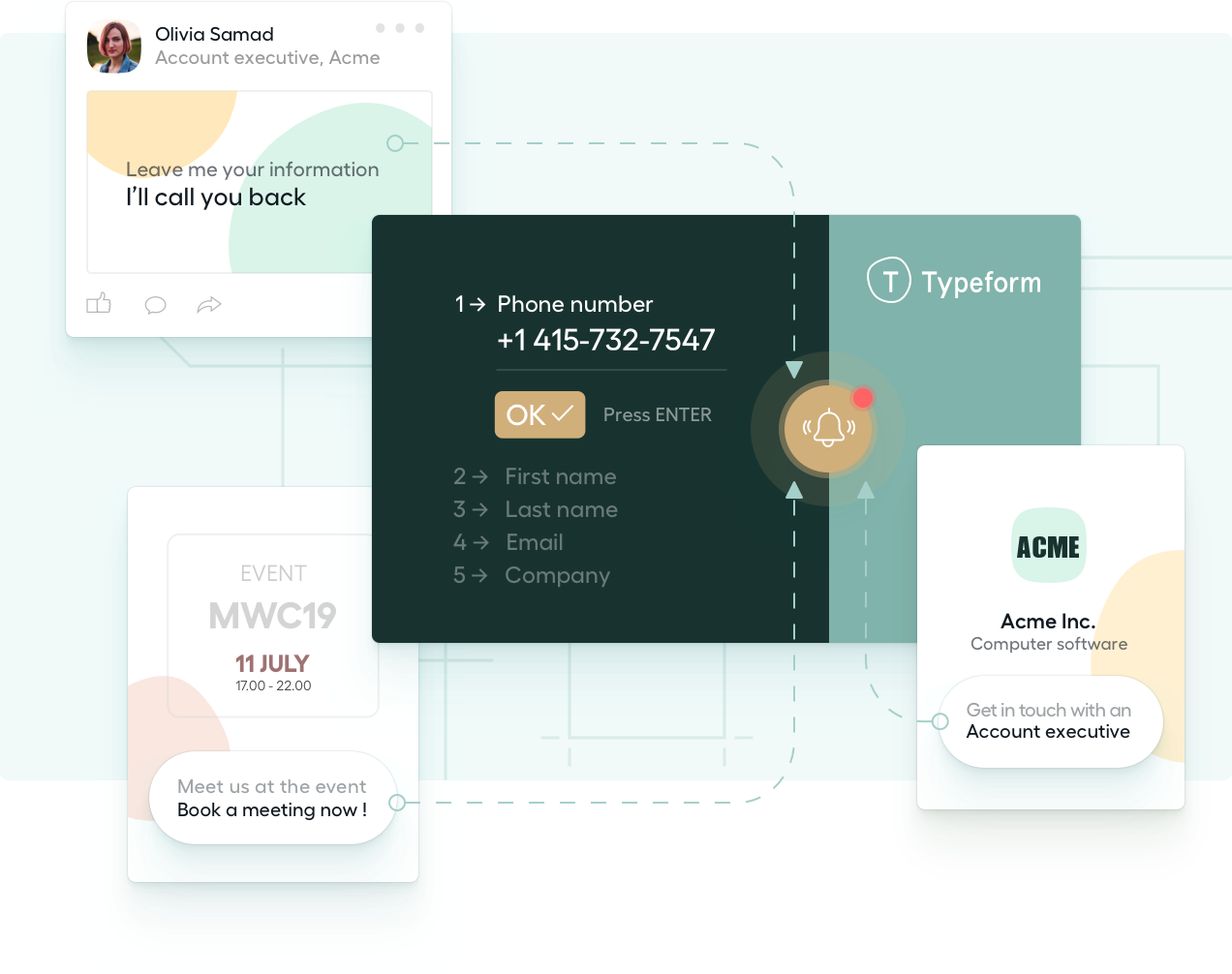 Integrar Aircall y Typeform permite satisfacer a sus prospectos y clientes con una respuesta más rápida y mejor informada. Recopile los datos de sus contactos en segundos para que su equipo de ventas pueda responder de inmediato a las solicitudes de llamada. Las respuestas a las encuestas aparecen en su panel de control Aircall para que su equipo sea más eficiente durante las llamadas.