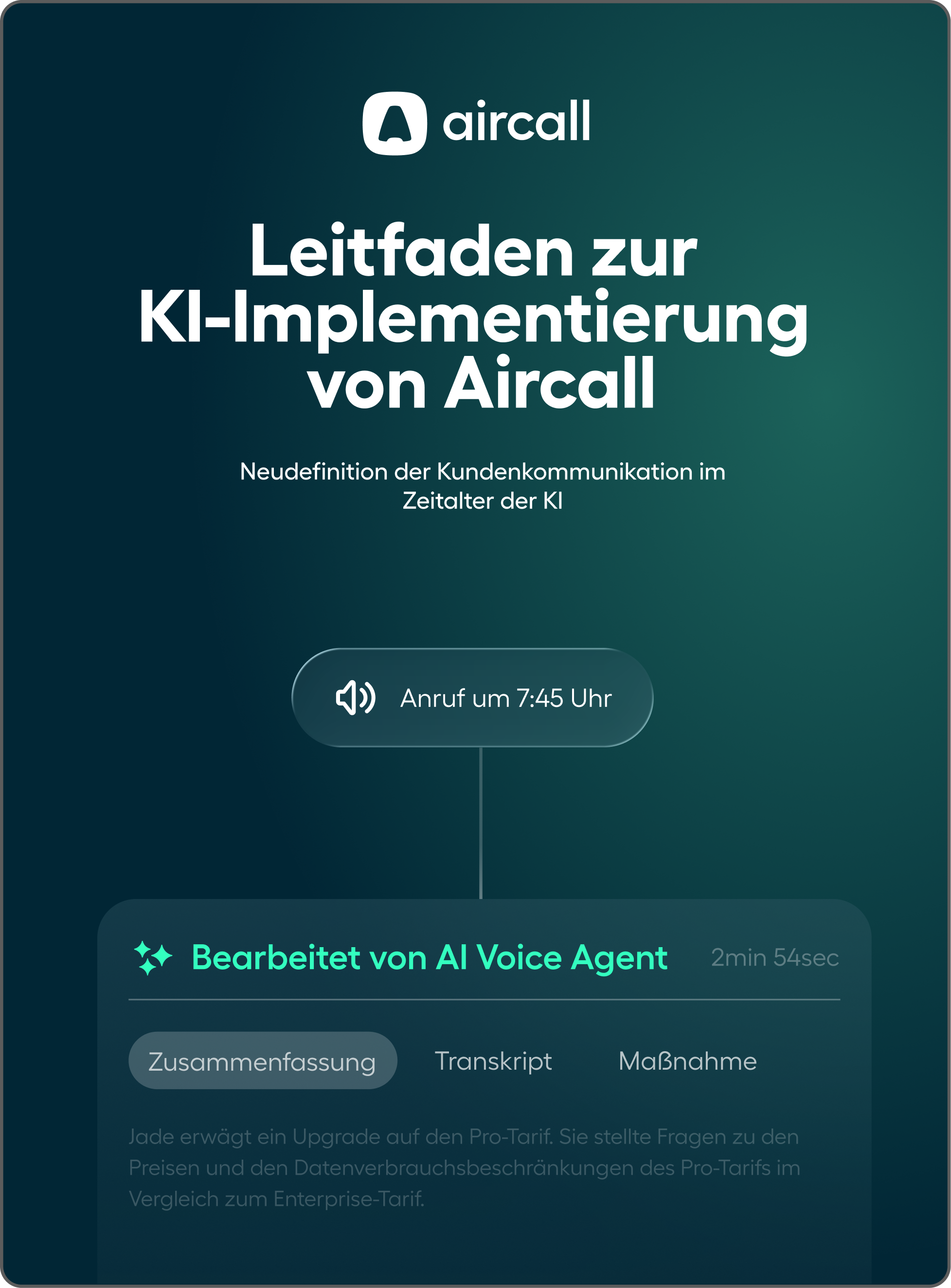 Dieser Leitfaden bündelt Aircalls Erfahrung aus über 21.000 Unternehmen zu einem klaren Fahrplan, um KI schnell und sicher einzuführen – mit messbaren Ergebnissen ab dem ersten Tag.